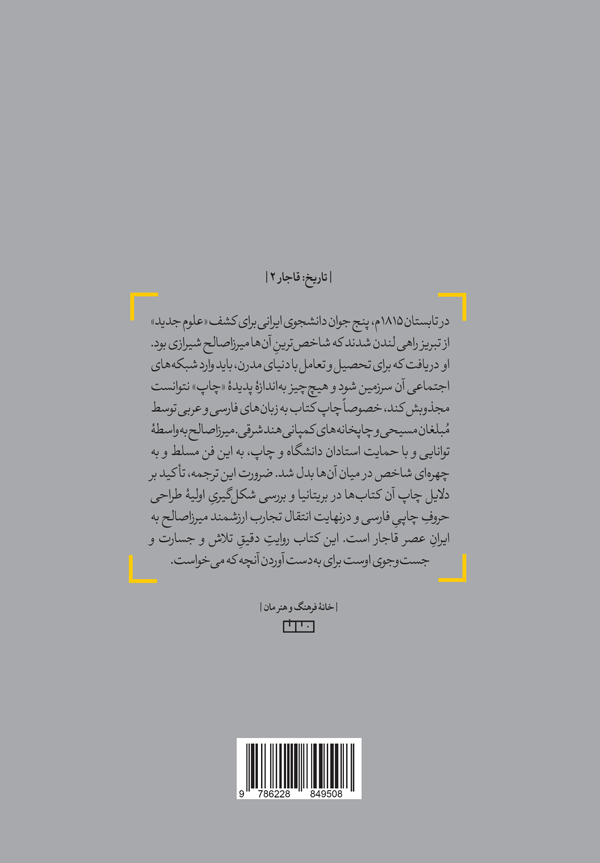 این کتاب به تلاشهای میرزاصالح شیرازی در یادگیری چاپ و طراحی حروف فارسی در بریتانیای قرن ۱۹ پرداخته است.